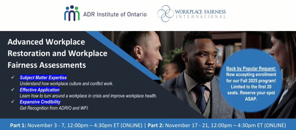 Opportunities in workplace mediation and workplace restoration are flourishing. This program will equip you with the tools you need to effectively meet the demand. Taken and recommended by dispute resolution and human resources leaders from diverse professional backgrounds within public and private sectors, this is by far our most popular program for good reasons! It is timely, incredibly interactive, and jam packed with information and resources that you can apply right away.